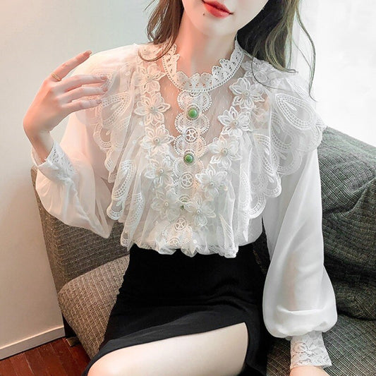 Embroidered Blouse Beaded Flower Chiffon Shirt Women's Long-Sleeved Shirt-ABD2488MC