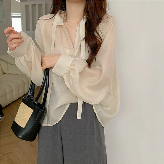 Elegant Blouse Autumn Spring Turn-Down Collar Single-Breasted Long Sleeve Shirts-