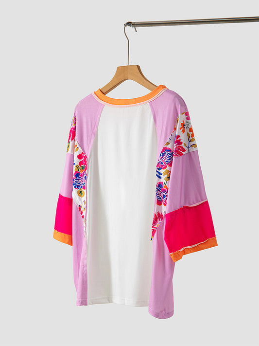 Floral Print Mix Color Block Knit Top Autumn Half Sleeve Round Neck Pullover Tops