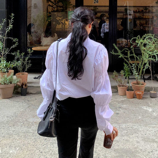 Women's Puff Sleeve Folds Design Korean Style Solid Simple Leisure Harajuku Loose Fashion Shirts-ABS2490GY