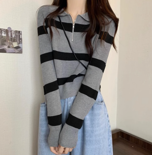 Zippered Sweater with Striped Knitted Sweater Underneath